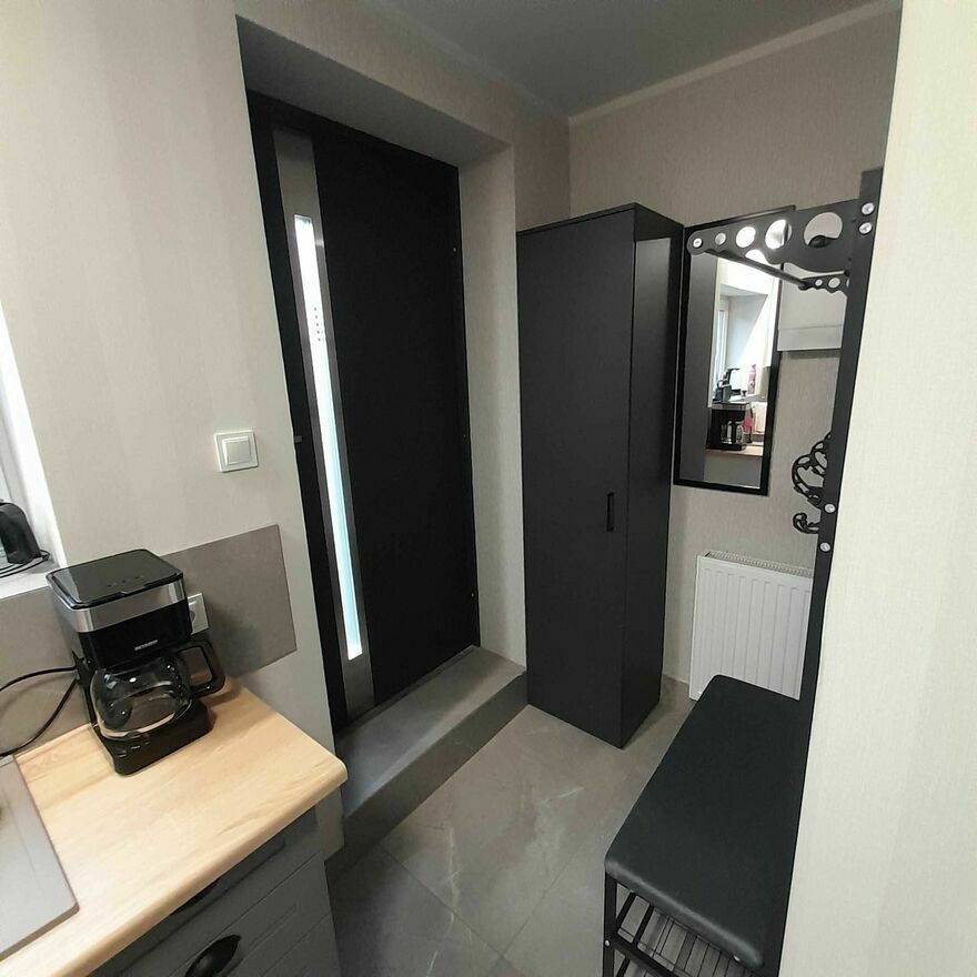 • korytarzyka z szafą na ubrania i stojakiem na buty.